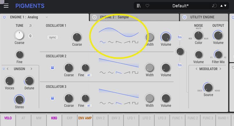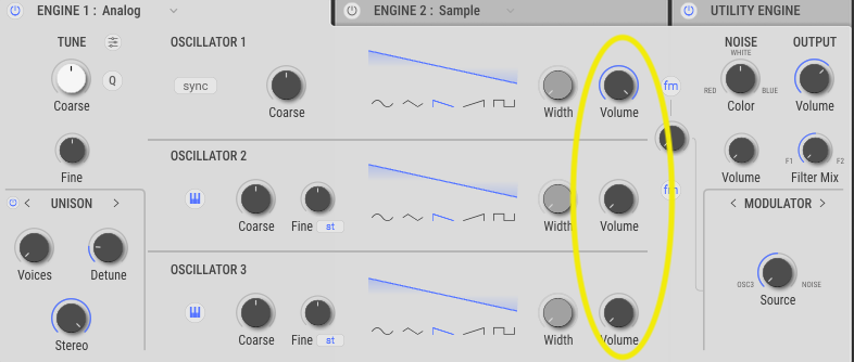 このEngine 1には3つのオシレーターが用意されていますが、オシレーター2と3のボリュームが0になっていますので、鍵盤を弾いてもオシレーター1の音しか聴こえない状態です(上図黄色の部分)。鍵盤を弾くと「ブー」「ジー」のような味気ない音が聞こえると思います。これはノコギリ波と呼ばれる波形です。