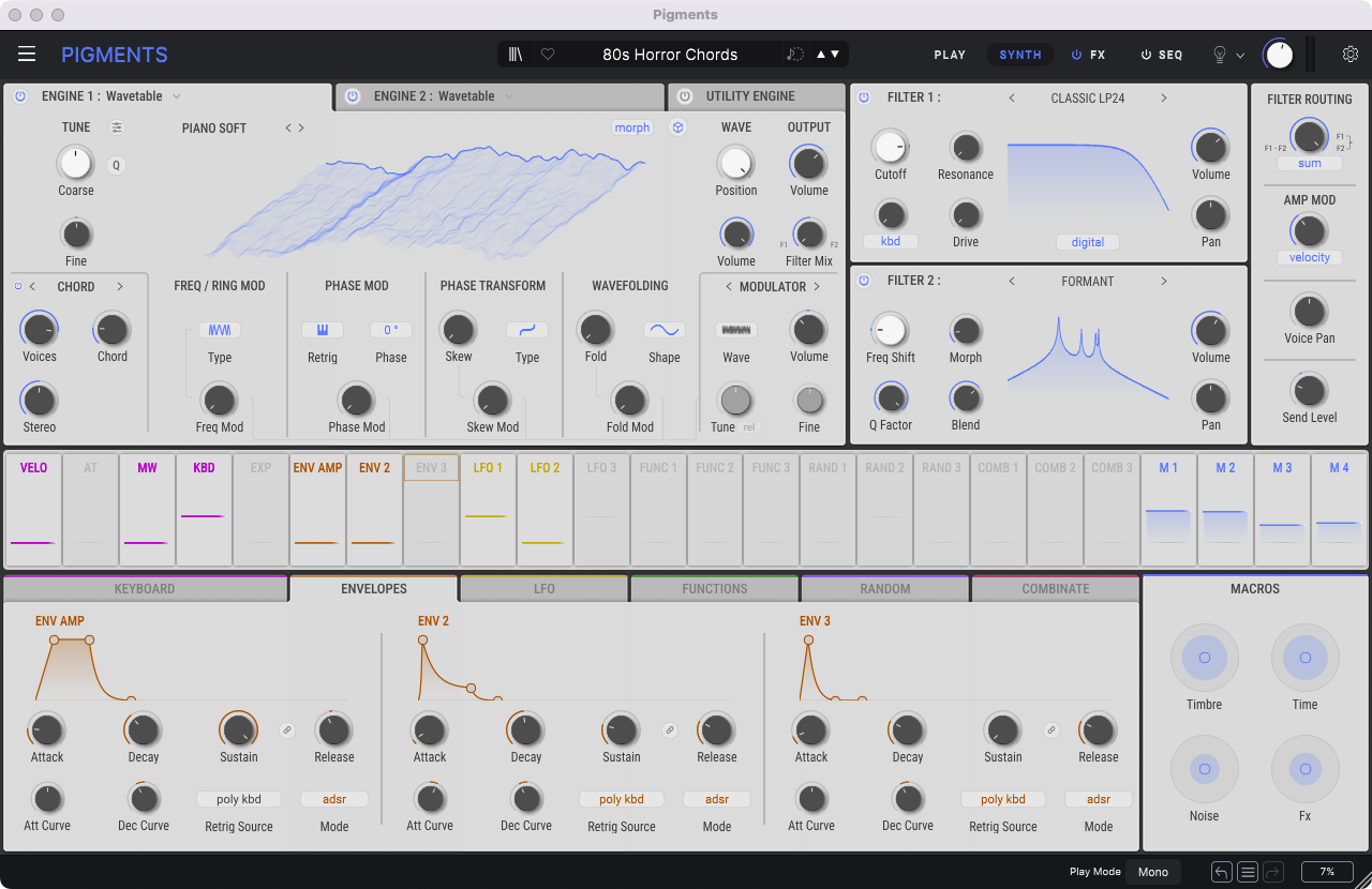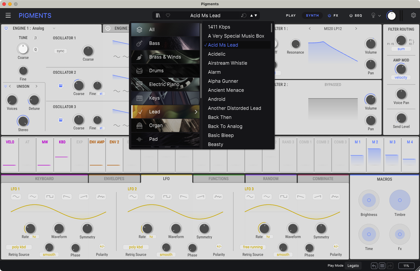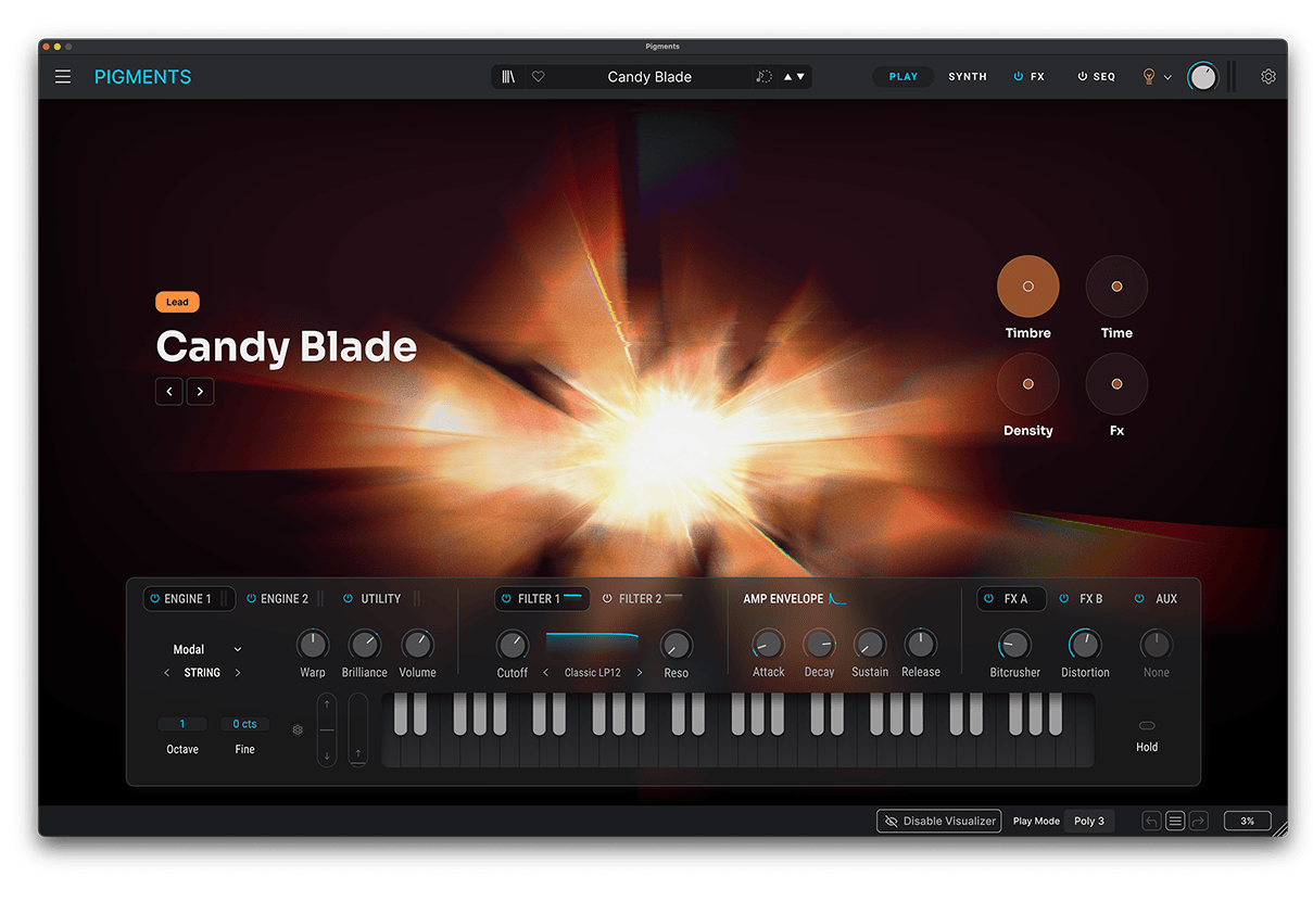 Pigmentsのプリセット音色にはこうした様々な工夫が施されたプリセット音色が収録されていますので、ぜひ試してみてください(下記はPigments7製品版)。