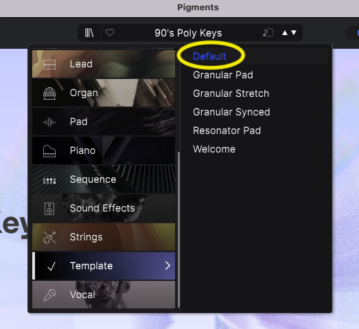 ではそのテンプレートプリセットを呼び出してみます。中央上部にある音色名の部分をクリックすると、音色カテゴリーが選択できますので、スクロールすると「Template」が現れますので、そこで「Default」を選択してください。(下図、黄色枠の部分)