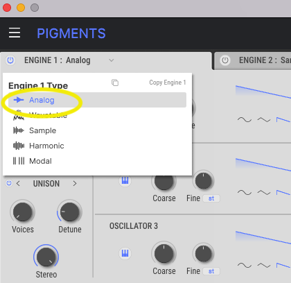 左上のセクションがシンセエンジンのセクションで、3系統のシンセエンジンが用意されています。この状態ではENGINE 1だけが発音する状態です。Pigmentsは3つのエンジンスロットに複数の音源方式を割り当て可能な、マルチエンジン構成を採用しています。このプリセットのENGINE 1は、「Wavetable」というものが選択されているので、これををアナログシンセに切り替えてみましょう。