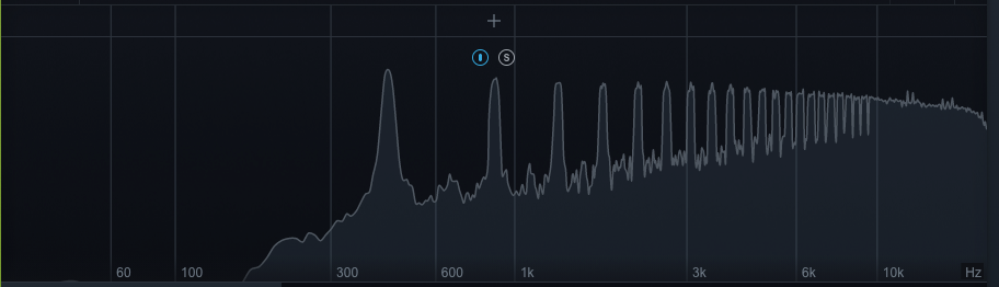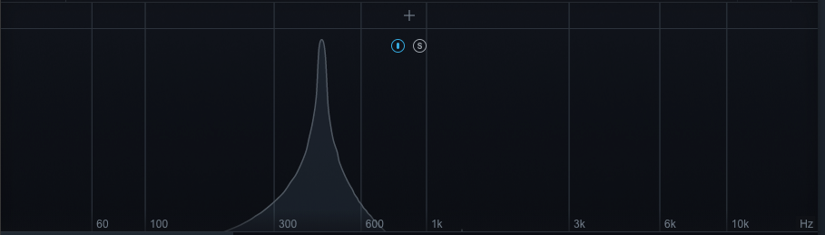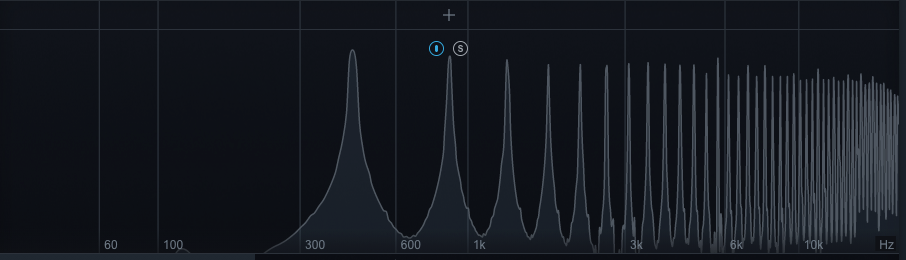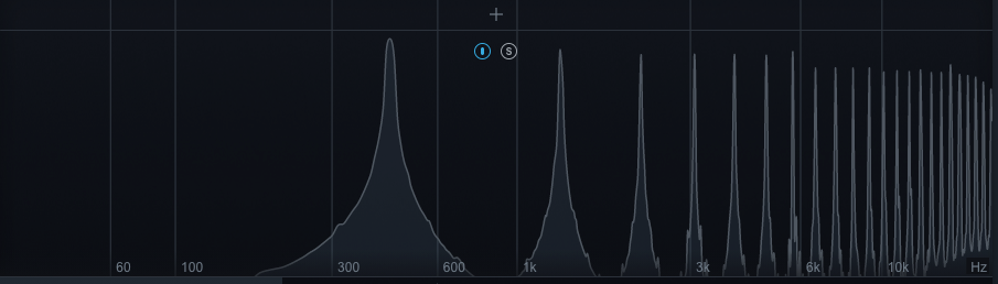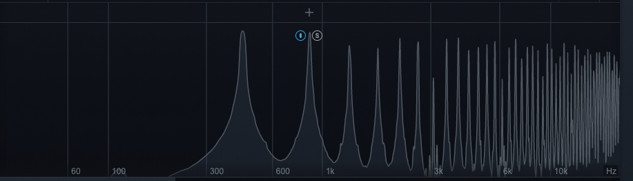 440Hz(ラの音)のサイン波を鳴らして周波数分布をiZotopeのOzoneで見てみると、下図のように表示されます。山になっている部分が440Hzですが、その他に倍音は含まれていません。※サイン波は自然界にはほぼ存在しない音です。