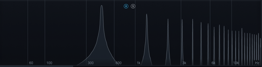 倍音とは基音(ここではラ:440Hz)の他に含まれる、整数/非整数倍の様々な周波数のことですが、倍音の含まれ方によって音色の特徴が決定されます。※同じラの音でもピアノとストリングスを区別できるのは、倍音構成が異なることも一つの理由です。