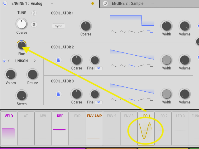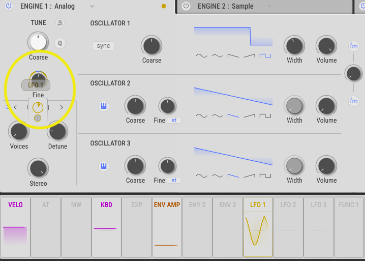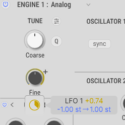 ビブラートの深さは、Fineのつまみの下に現れるLFO1の効果の深さを調節できるバーチャルツマミで変更することが可能です。