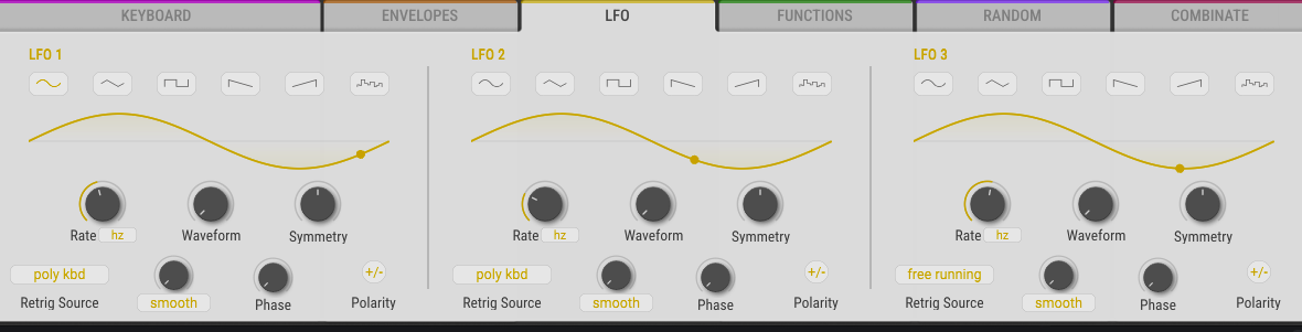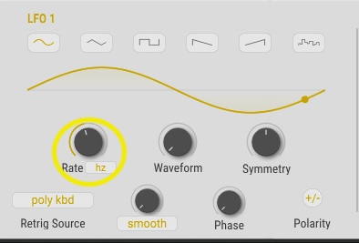揺れの周期の速度(Rate)は下記のつまみを動かすことでコントロールできます。5Hzだと1秒間に5回の揺れがうまれます(Pigmentsは200Hzまで設定可能)。LFO1の波形を変えると音程の変化がかわります。