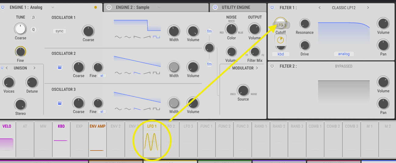 先ほどと同様の方法で今度はFilterのCutoffというツマミにドラッグ&ドロップします。