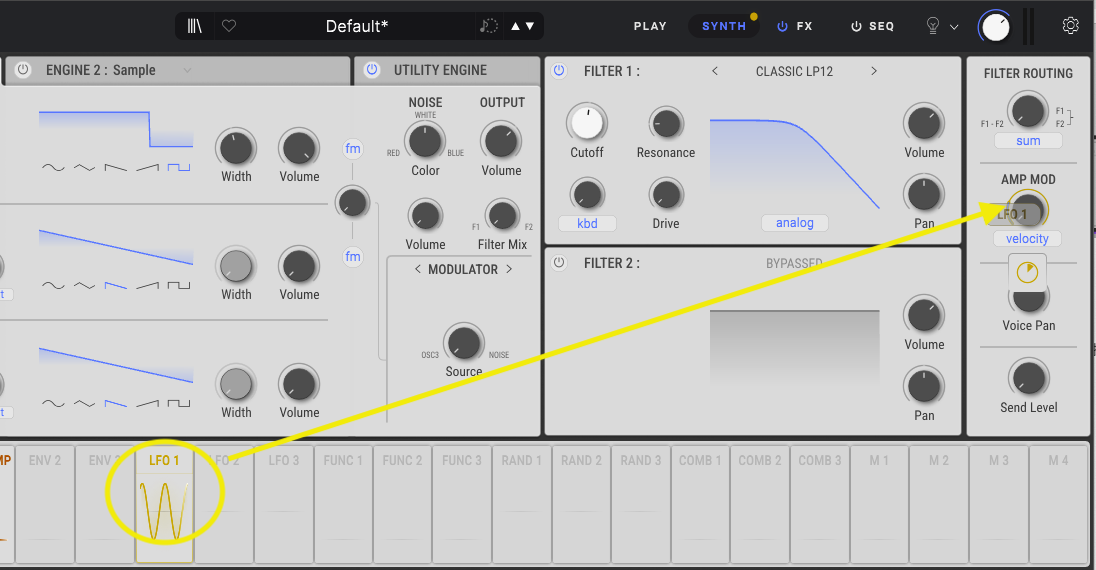 トレモロの場合は音量をコントロールするAMP MODです。すでにVelocity(鍵盤を叩く強さ)がアサインされています。強く打鍵するほど音量が上がる設定がすでにされていたわけですが、これにLFOでトレモロが追加されます。LFO1の波形を変えると色々な種類のトレモロがうまれます。