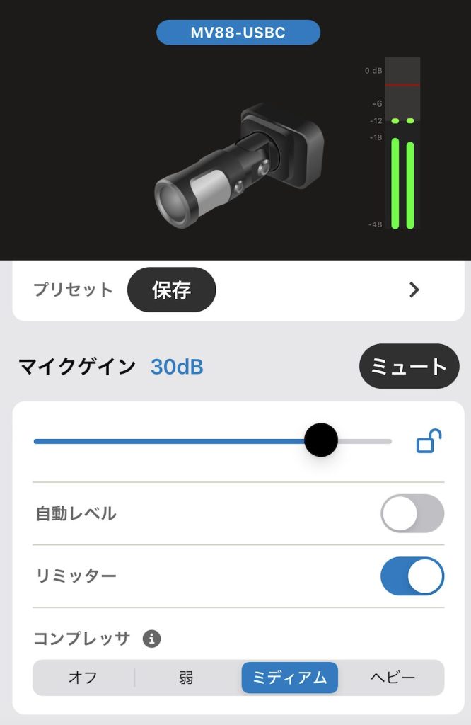 さらに上記のMOTIVオーディオで行っていたマイク本体の設定も、MOTIV VIDEO内部の項目からアクセスでき、変更も可能です。標準カメラアプリだとMOTIVオーディオとカメラアプリを交互に切替ながら設定する必要がありかなり面倒なので、もしテイクによってMV88 USB-Cのマイク設定を微調整しながら撮影したい場合などは、このMOTIV VIDEOを使った方が無難ですね!