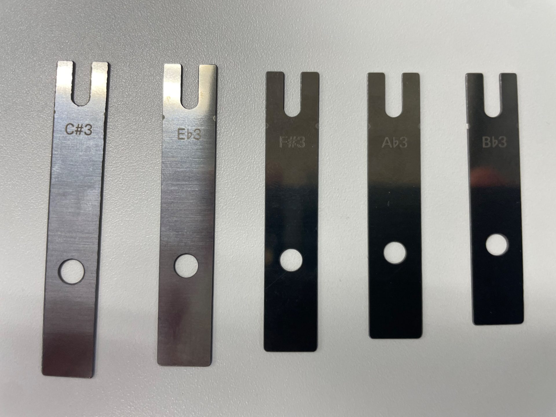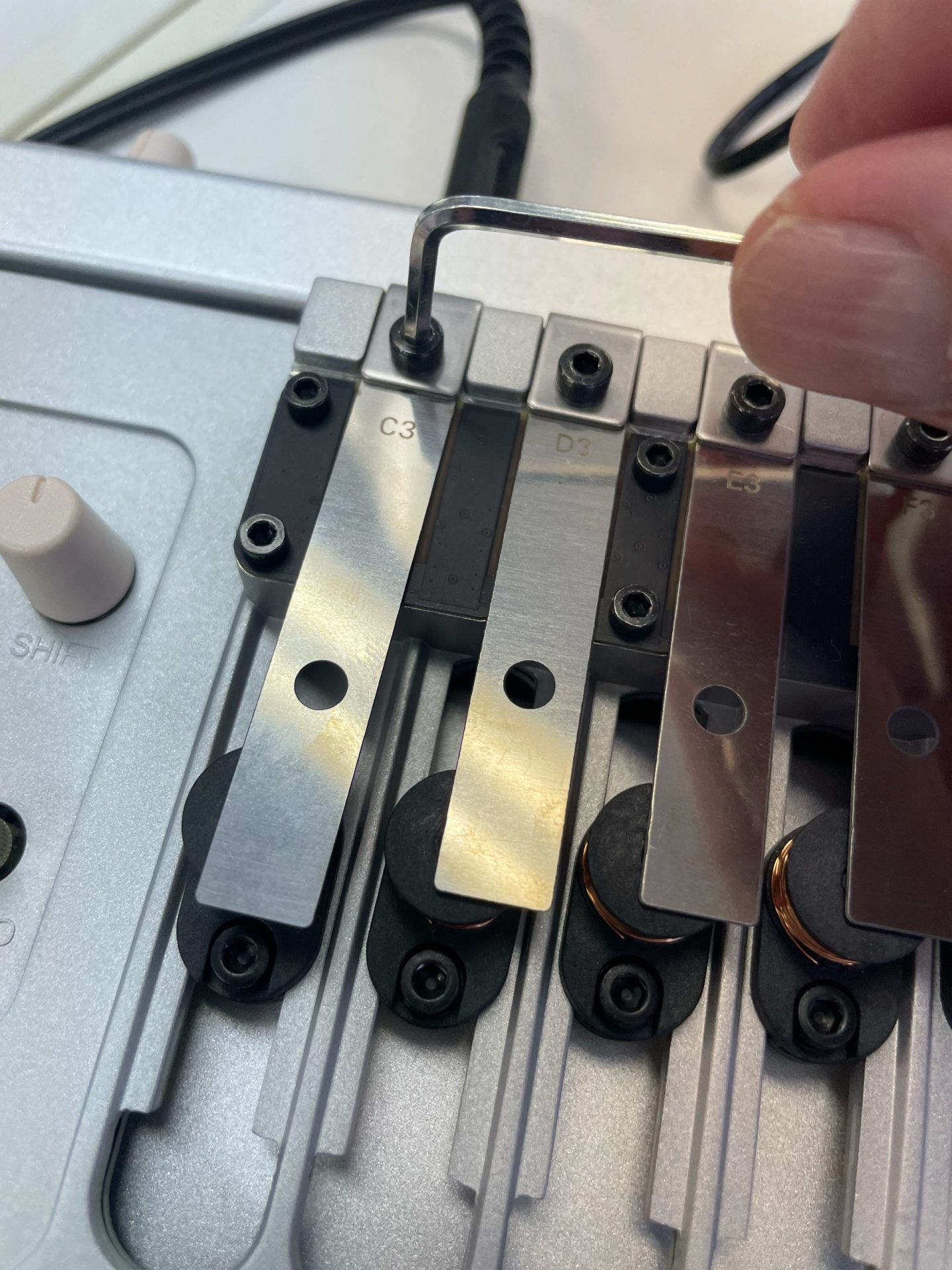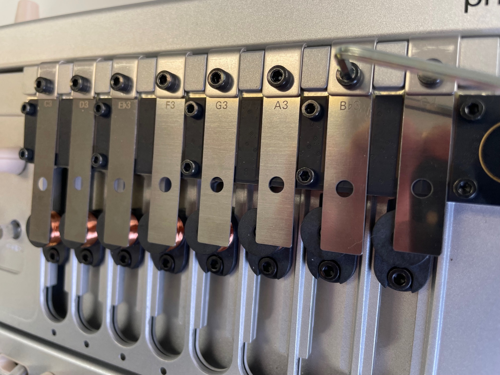 予備で「C#3、E♭3、F♯3,A♭3、B♭3」の5枚も付属しているのでマイナースケールなども演奏可能です。レゾネーターを交換する場合は付属の六角レンチで一つ一つ交換します。どこに何を挿すかは自由です。