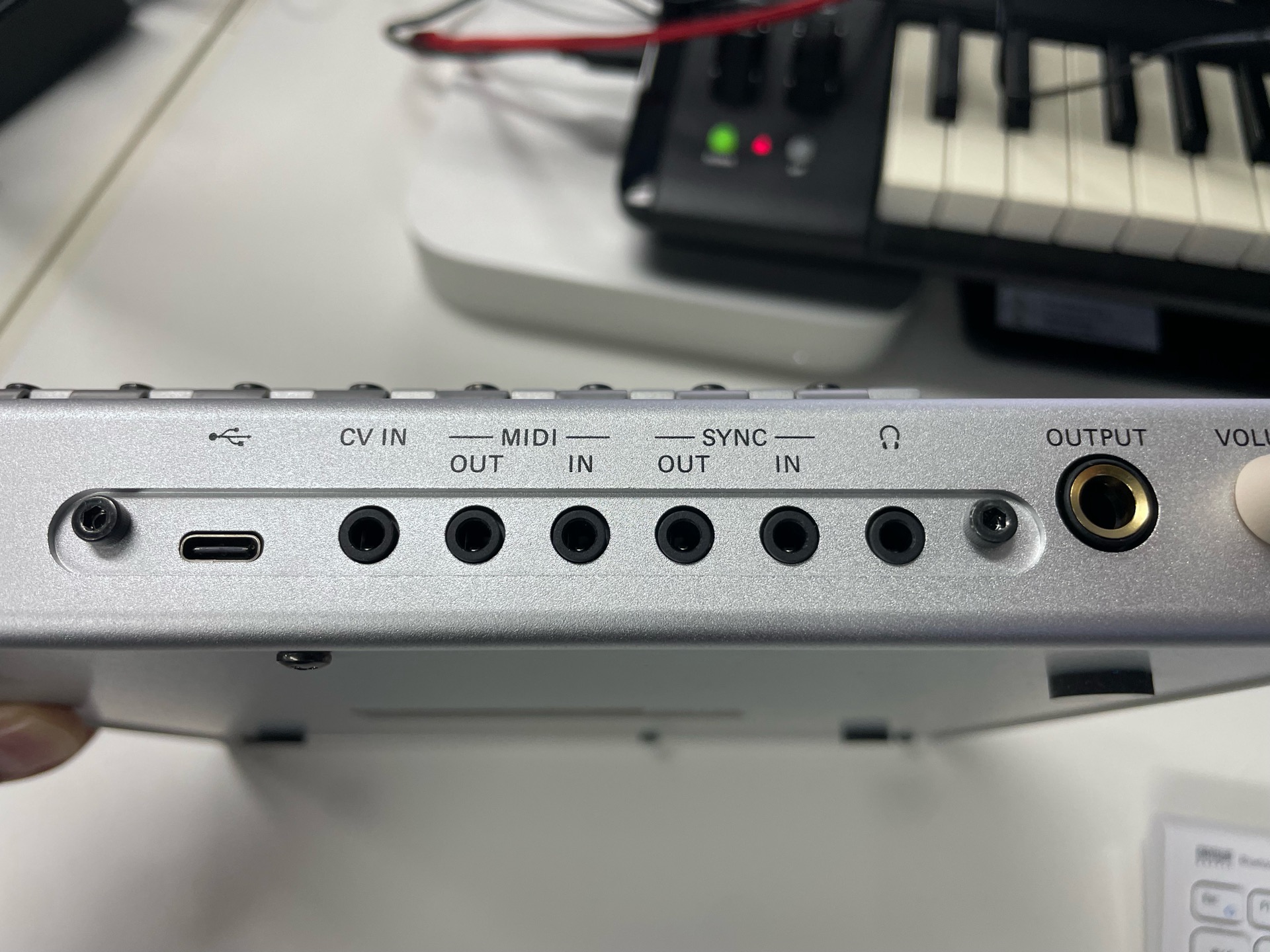 リアパネルには、左からUSB-C、CV IN、MIDI IN / OUT(TRS-Aタイプ)、Sync OUT / IN、そしてヘッドホン端子を搭載。メインアウトはモノラル仕様となっています。
