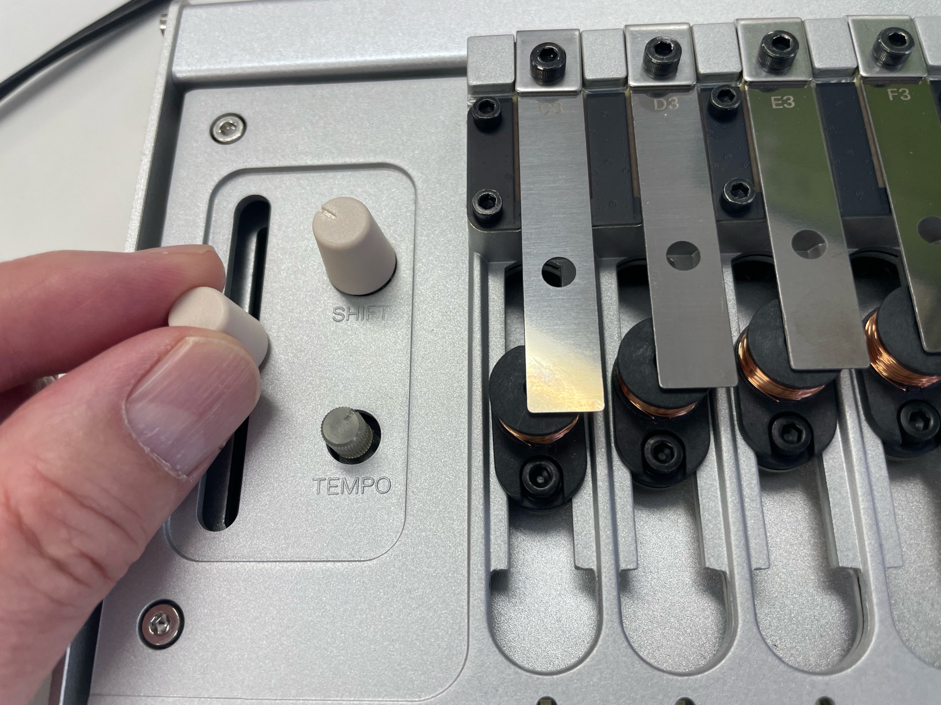 出荷時は「C3、D3、E3、F3、G3、A3、B3、C4」という名前の8枚のレゾネーターが本体にセットされているようで、それぞれが「ドレミファソラシド」=Cメジャー・スケールの音程を奏でます。