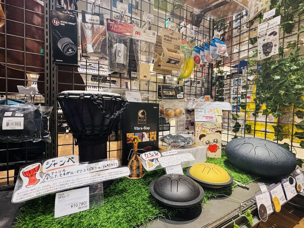 当店には常時、電子ドラム・スネア・ペダル類 ・シンバル類も多数、展示しています。その他カホンを中心としたパーカッションアイテムや民族楽器の取り扱い、レギュラー品から珍しい品まで、幅広いラインアップでお待ちしています。