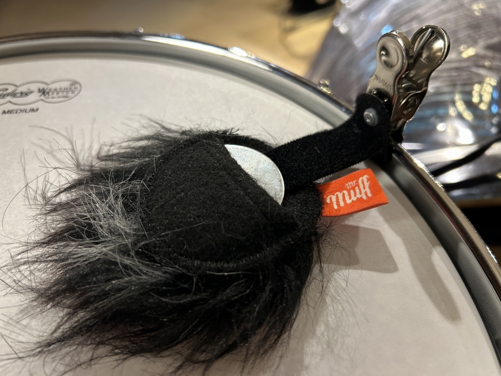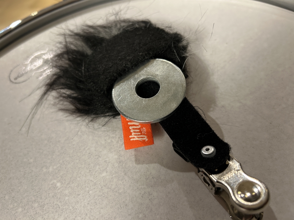 こちらは毛足の長いファー状のミュート。クリップでリムに固定して、打面に置くようにして使用します。