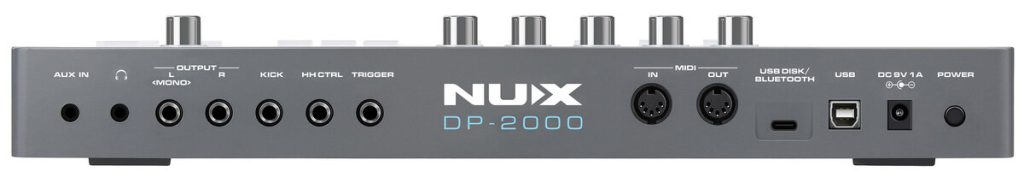 NUX DP-2000 には、ステレオ・アウト(L/R)に加え、ヘッドフォンアウト、AUXイン、MIDIイン/アウト、USB-C端子など、多様な接続端子が装備されています。