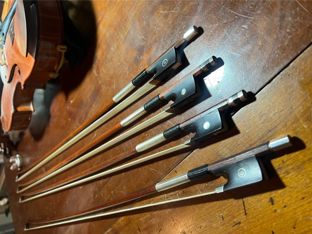 想定外にモダン楽器が選べなかったため、気を取り直して今度は弓の選定に。こちらも30本近くの新作・オールド弓を試させてもらいました。こちらは状態は問題ないものの、演奏面で弾きやすさ、音色を見ていき、最終的に初入荷の新規製作家3名の作品を含む4本の弓に巡り合うことが出来ました!