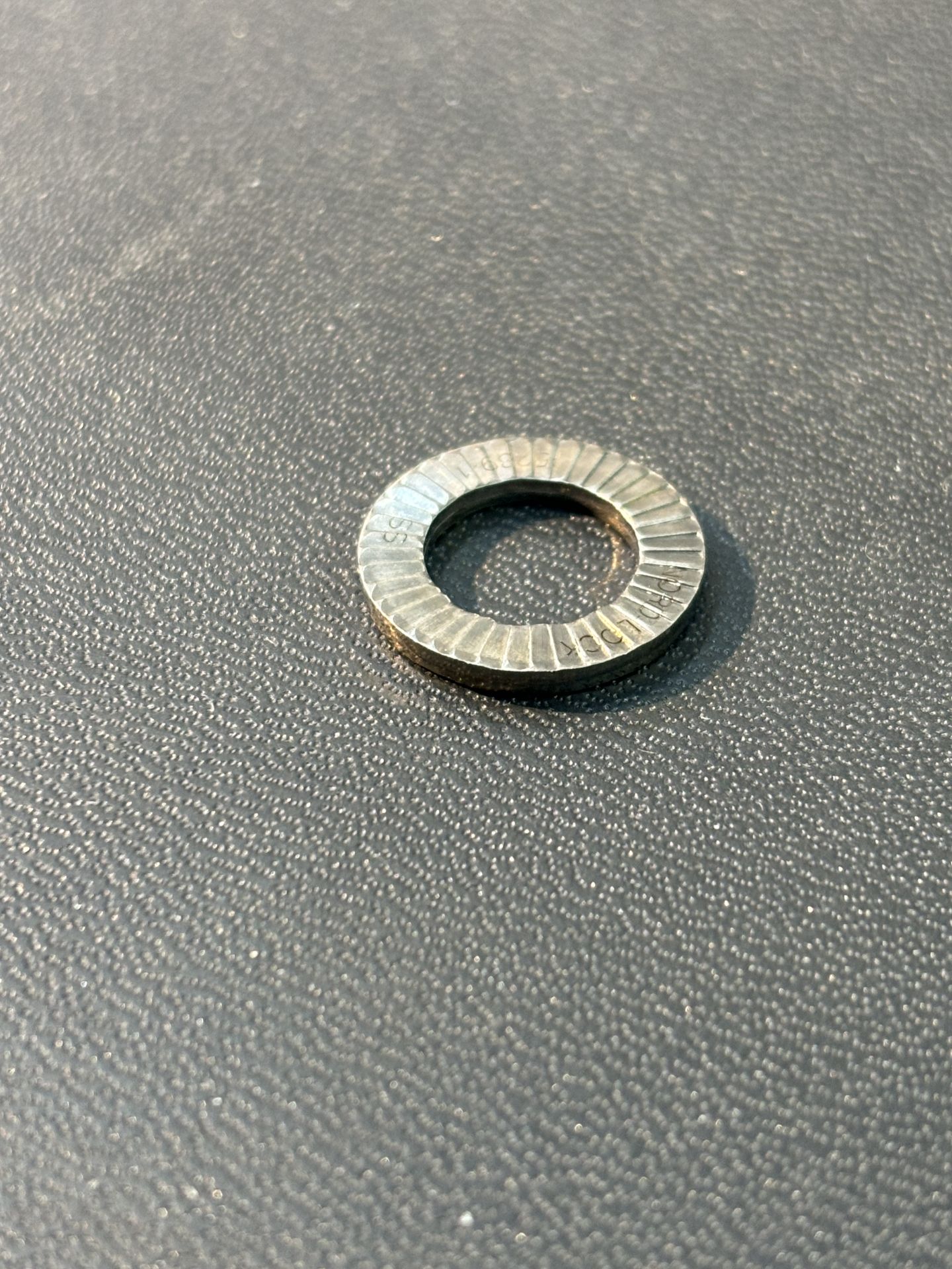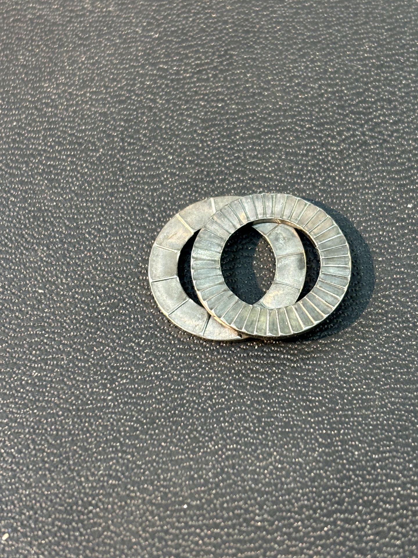 ノルトロックワッシャーは写真のような2層構造のワッシャーで、それぞれのワッシャー間の凹凸と外側のギザギザで緩みを防止してくれるものです。
