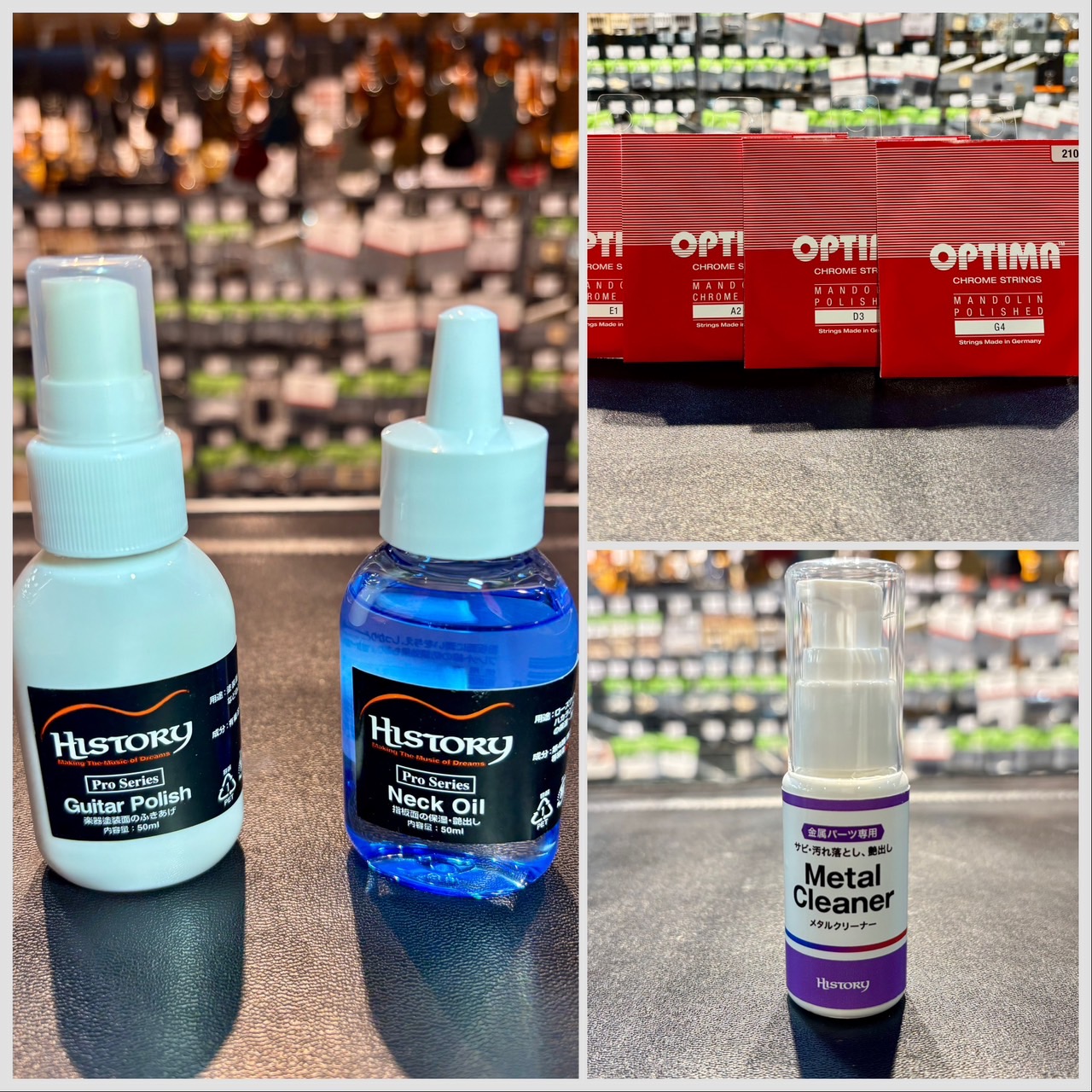 ラウンドマンドリン用弦、ペグワインダー、ニッパー、ドライバー、ラジオペンチ、指板オイル、ポリッシュ、クロス、フレット磨き用プレート、スポンジやすり、メタル・クリーナー、フレット磨き用クロス