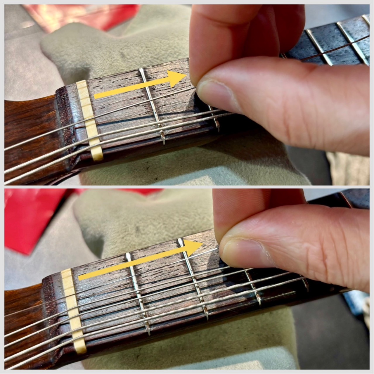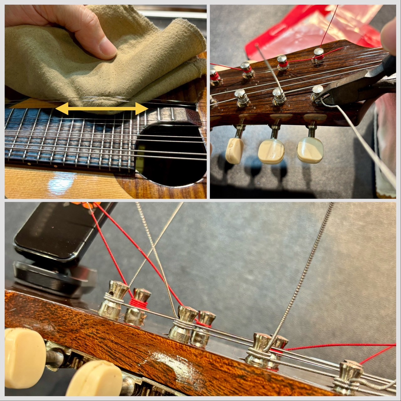 全ての弦を張り終わったら弦をクロスで少し上げて左右に伸ばします。チューニングして弦の余分をニッパーで切ります。