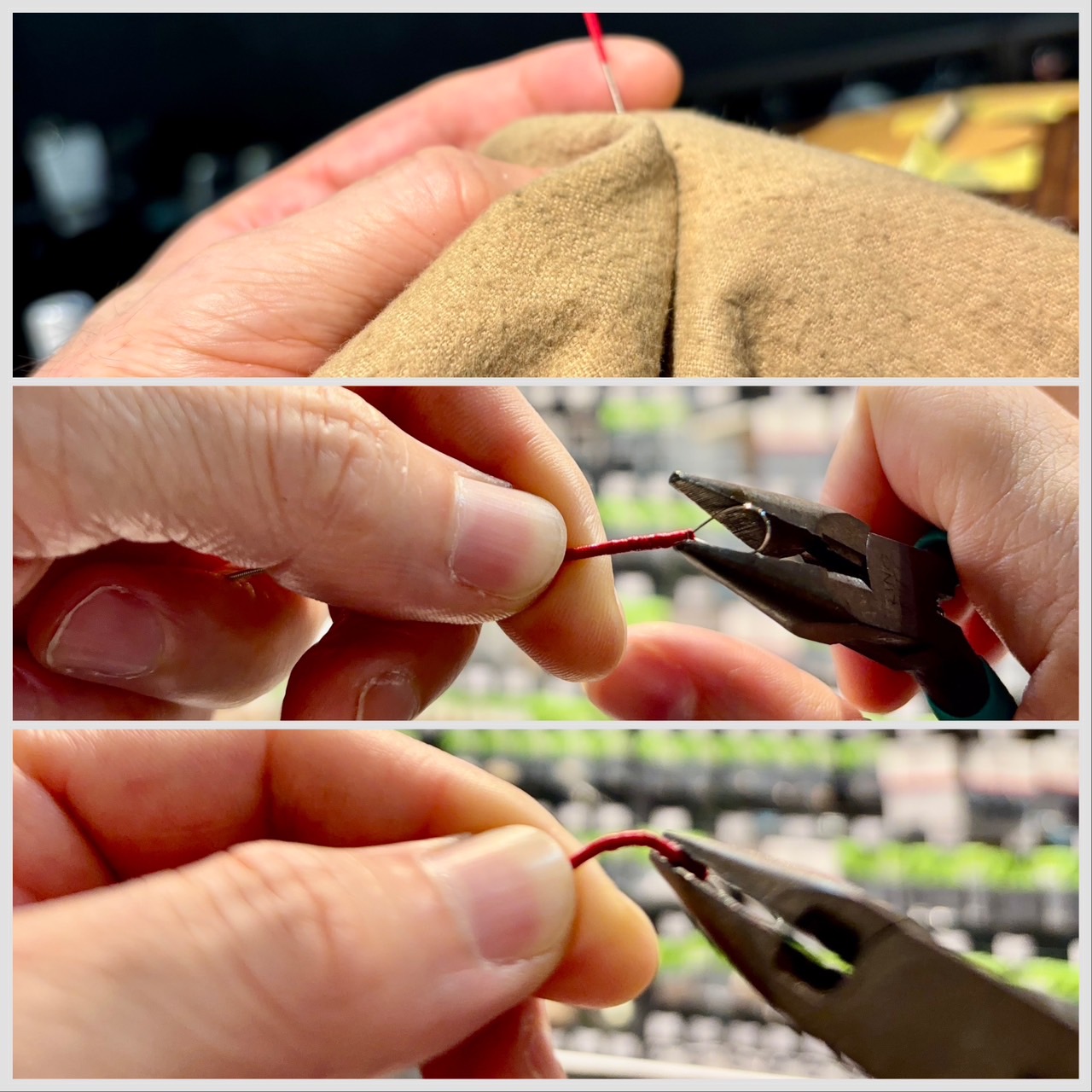 新しい弦をクロスで軽く伸ばして、丸まった癖を取っていきます。ラジオペンチで弦エンドの輪っかを細くしてから90度ぐらい曲げます。テイルピースに引っ掛けます。