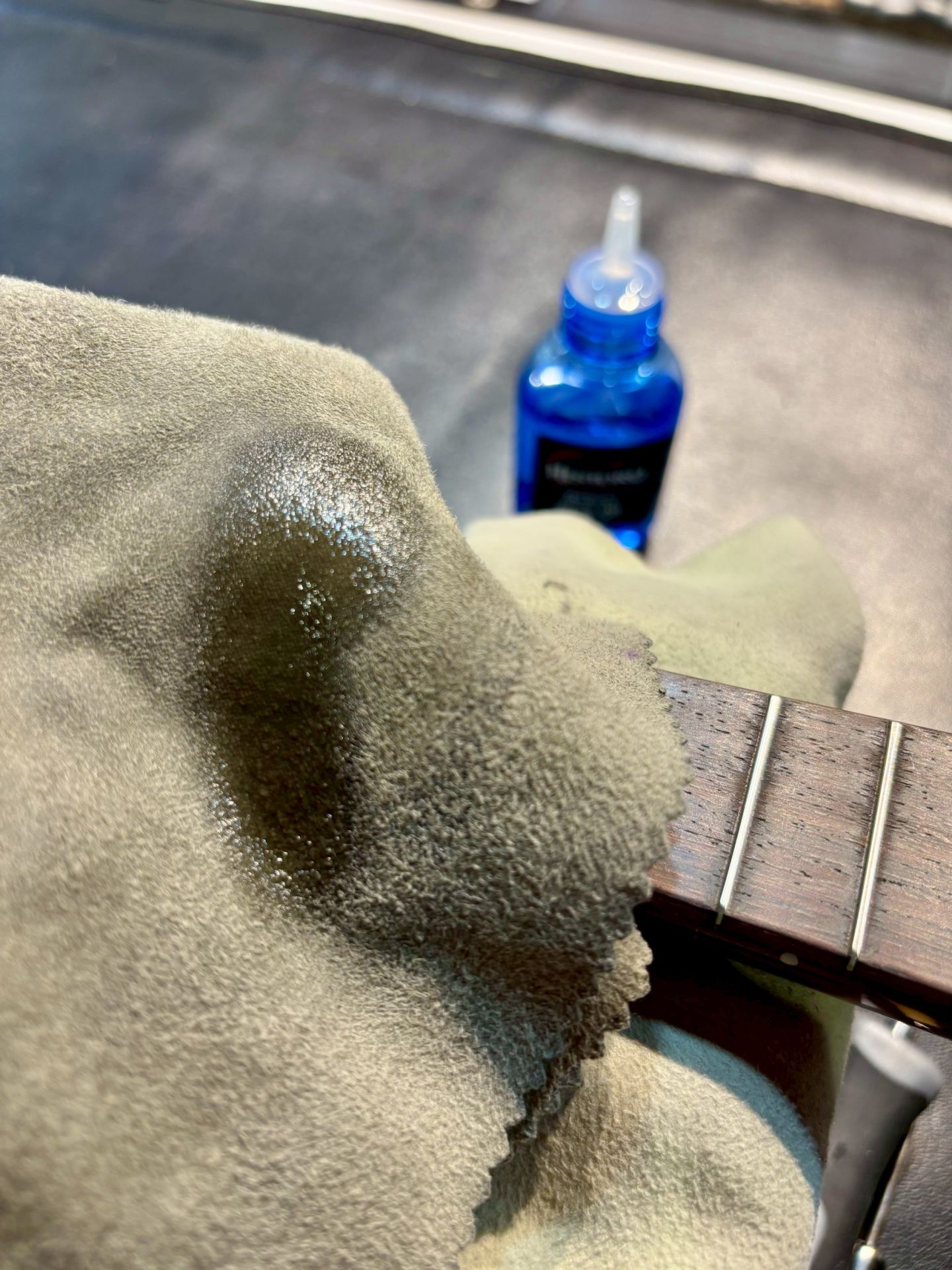 乾いたクロスで指板の余分のオイルを拭き取ります。