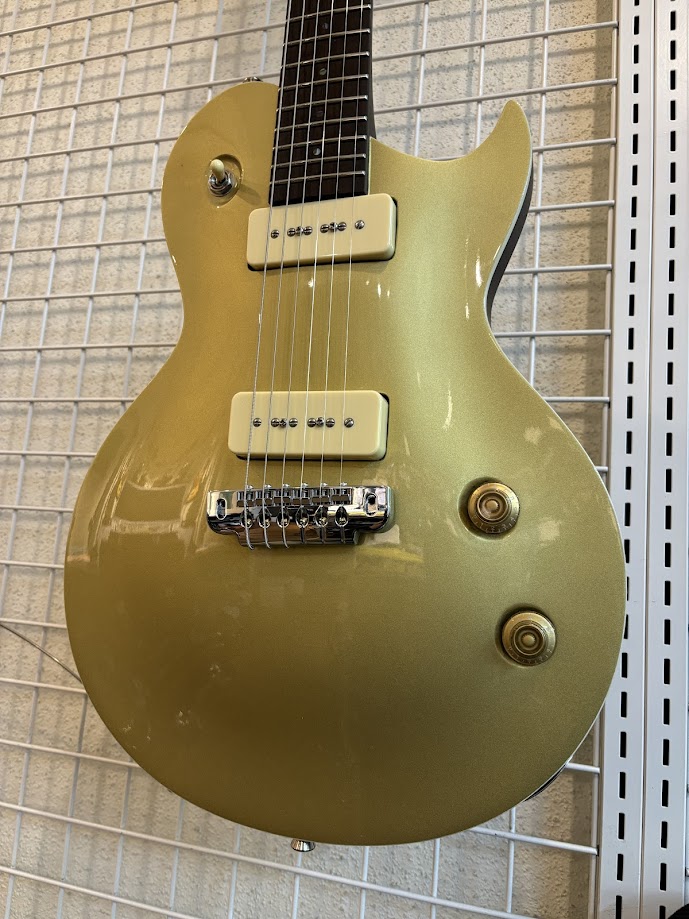 マホガニーボディのギターですが、マホガニー材自体が赤色や黄色に光るような色の濃い木材です。