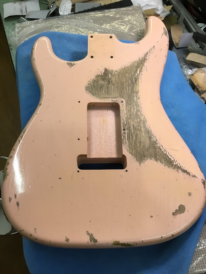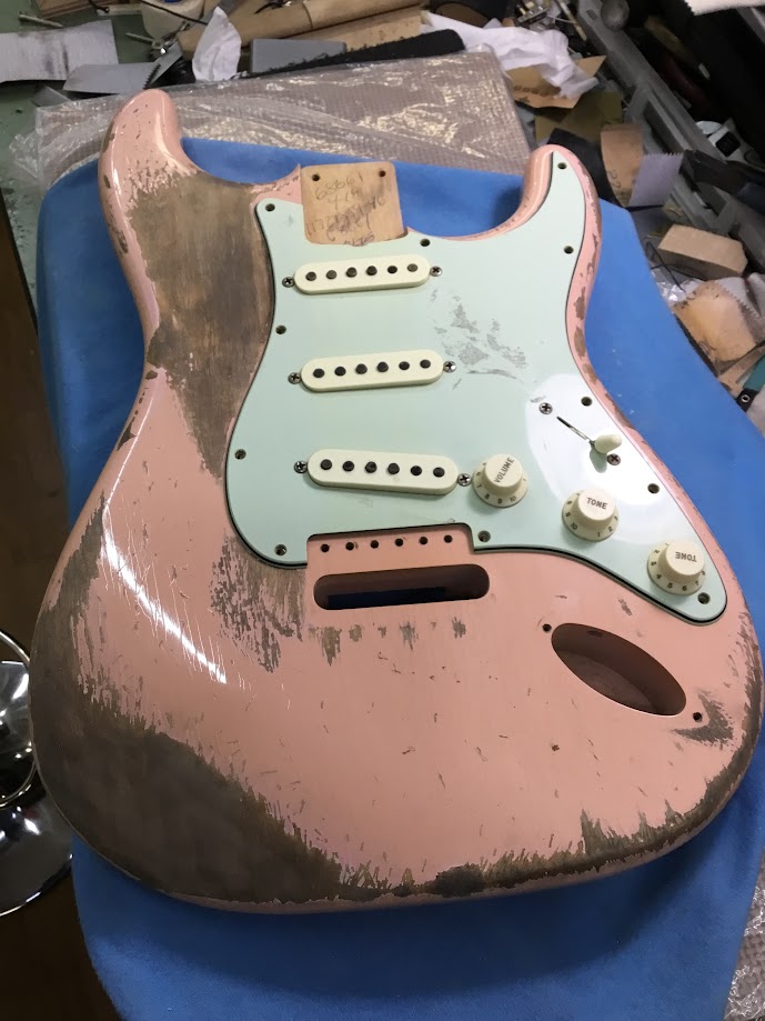 元々レリック加工されているギターでしたが、もっとヘヴィレリックにしたいというオーダーを受けた時の物です。