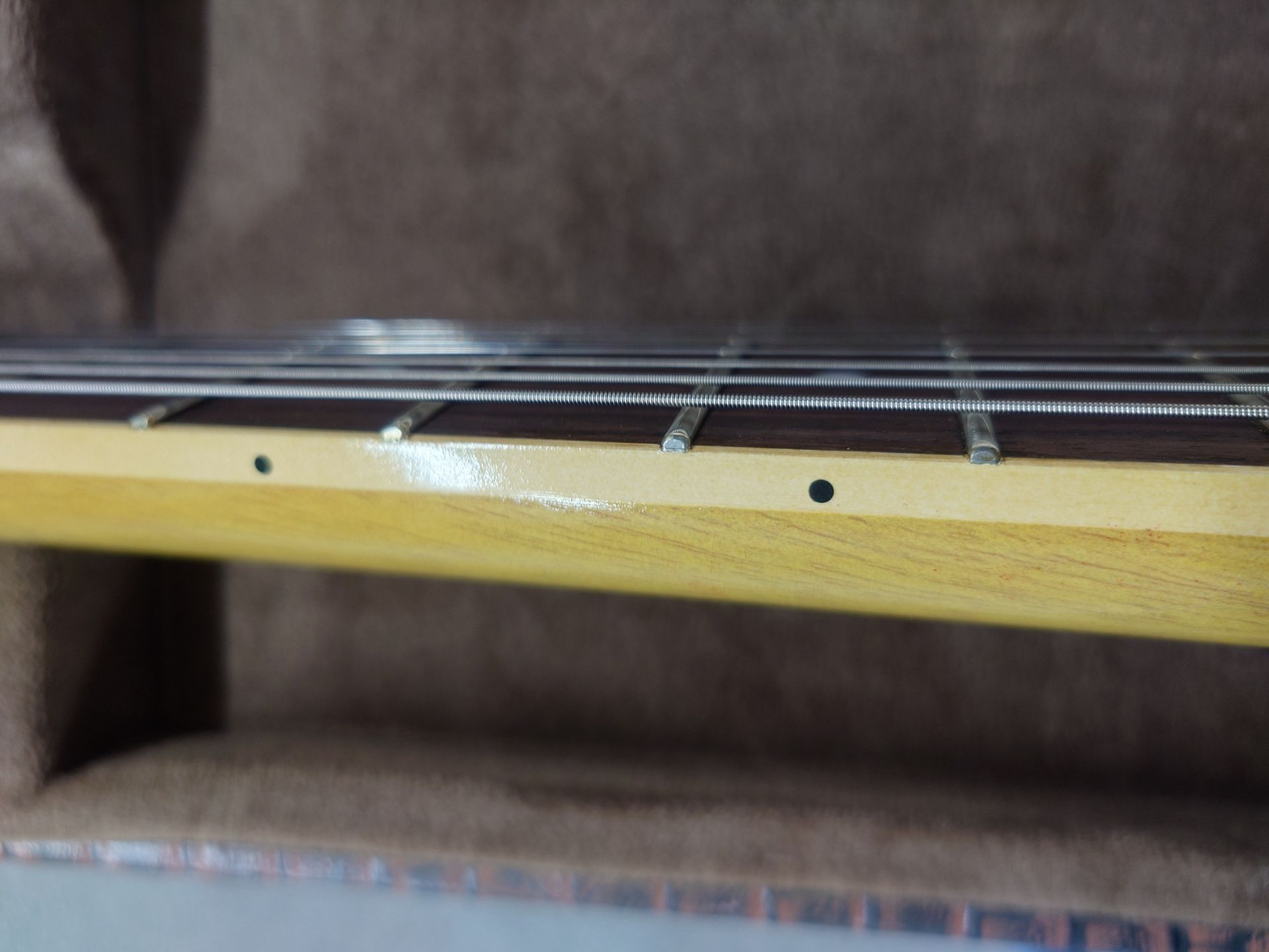 指板サイドに装飾はされていないけど、フレットの足は見えていない、という場合は大体こんな感じでフレットの足が収まる溝に詰物がされています。