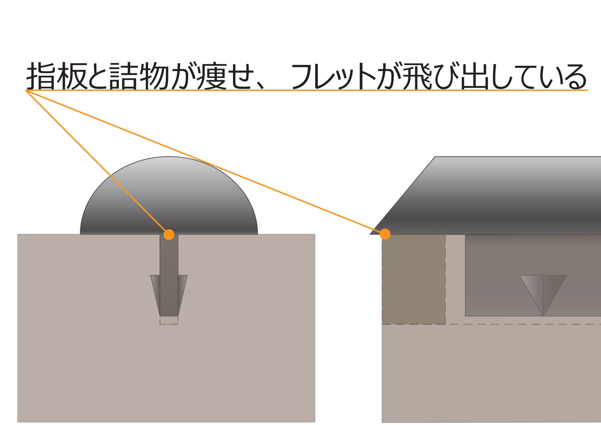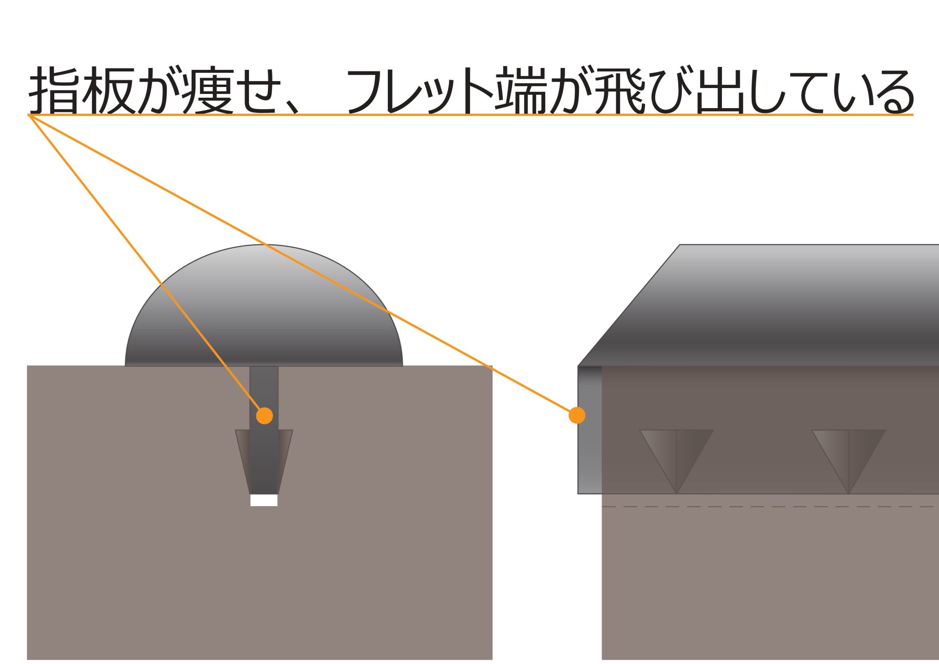 指板材が乾燥し収縮すると、湿度影響を受けないフレットは変わらず残るので、フレット端が飛び出します。