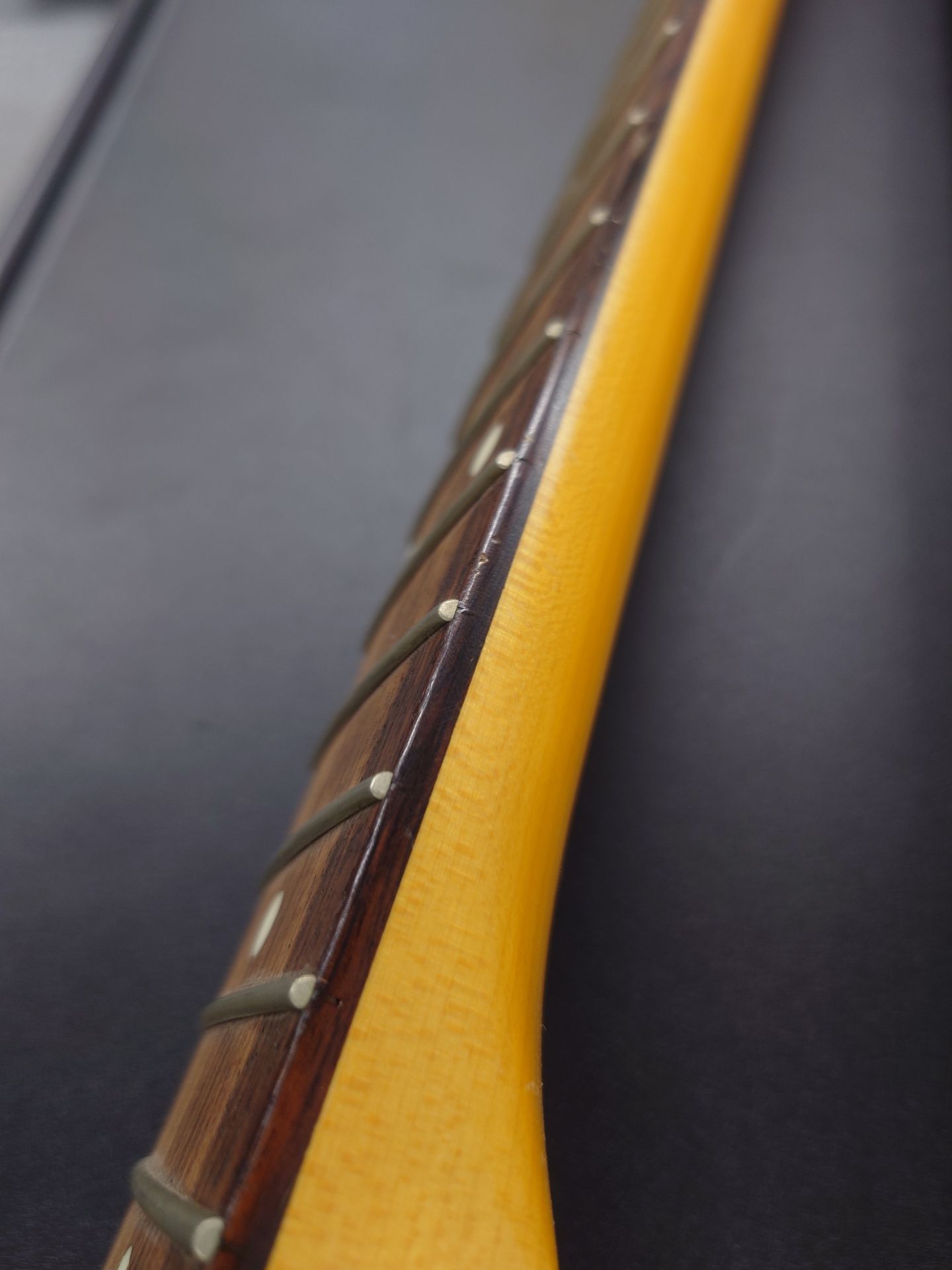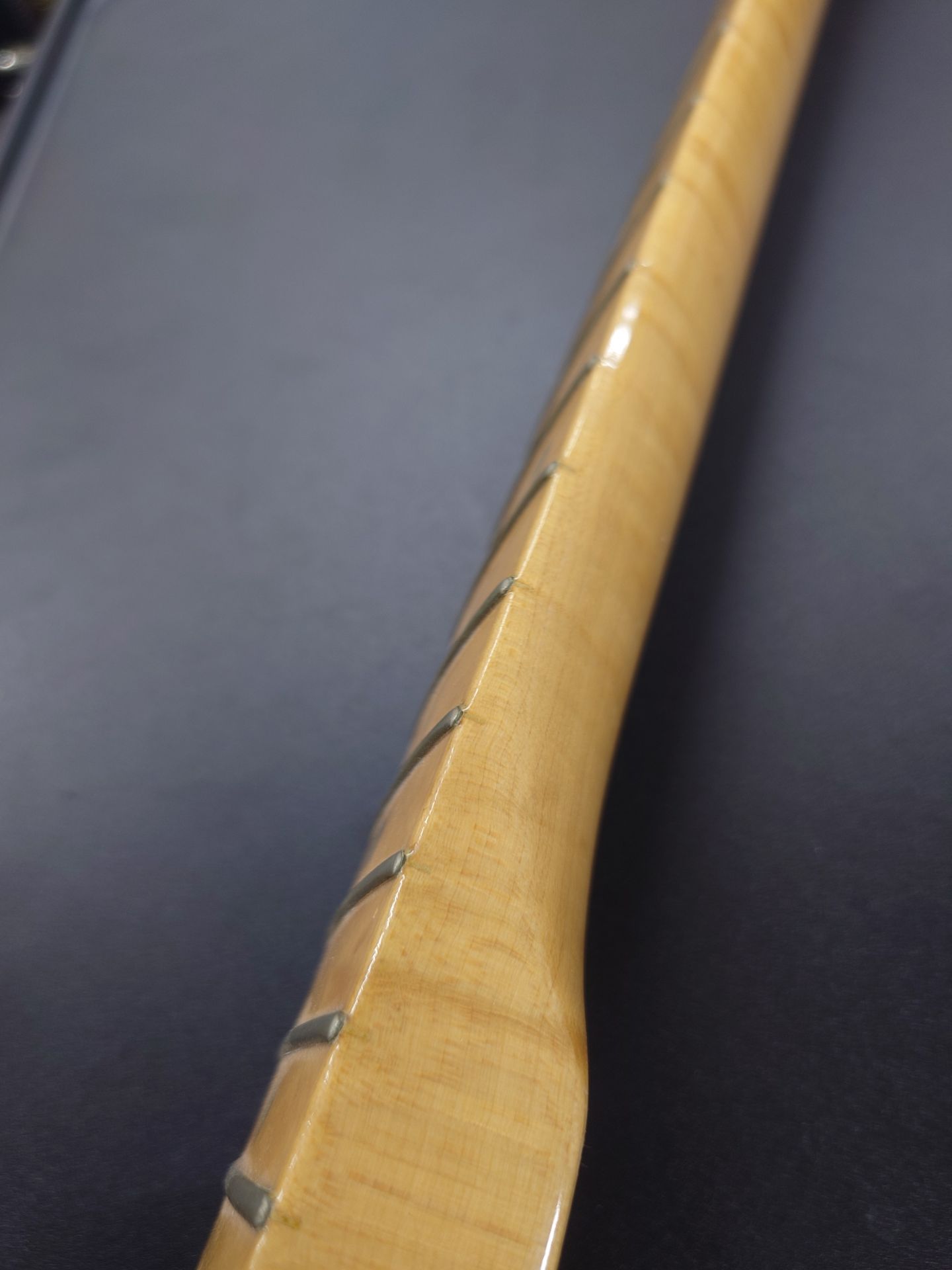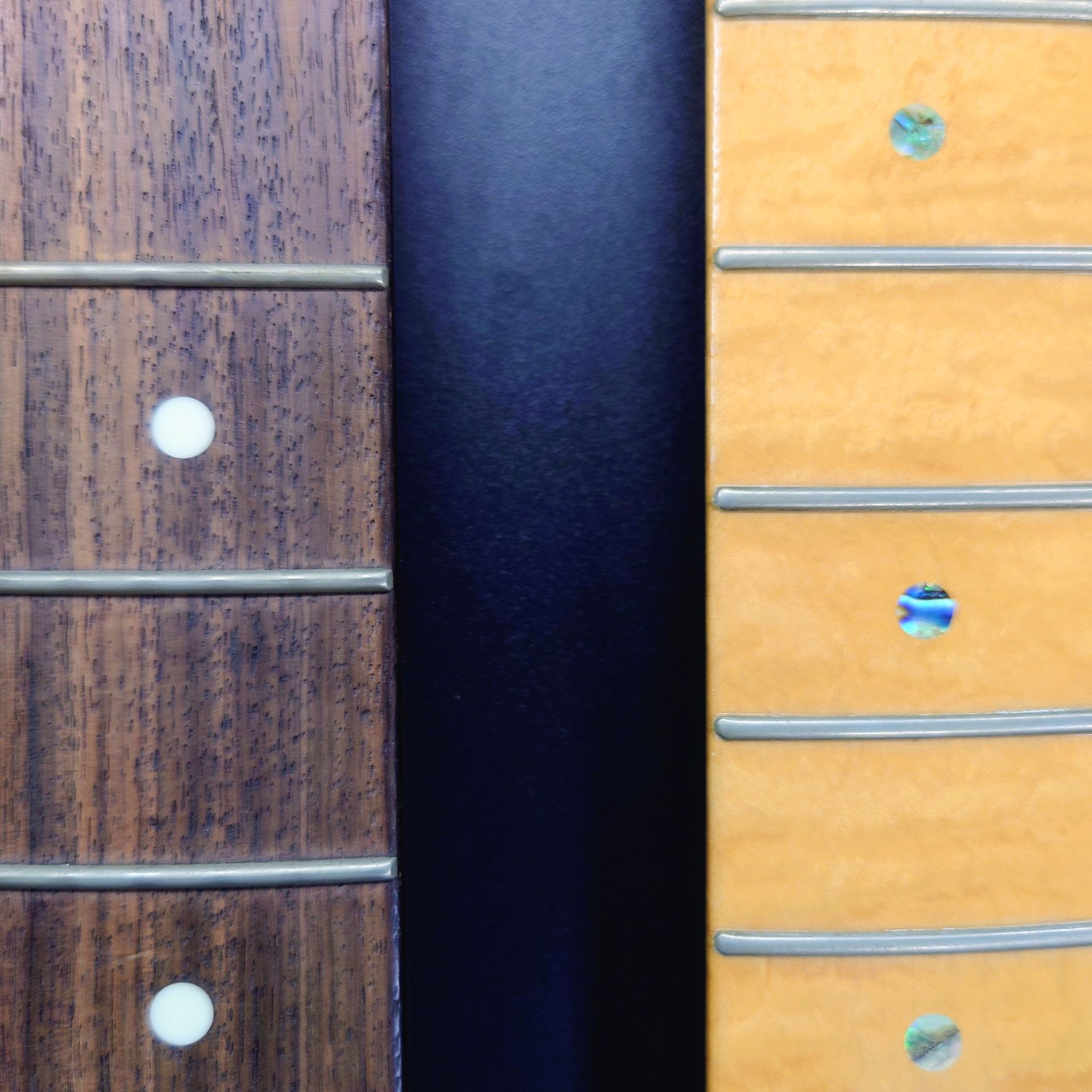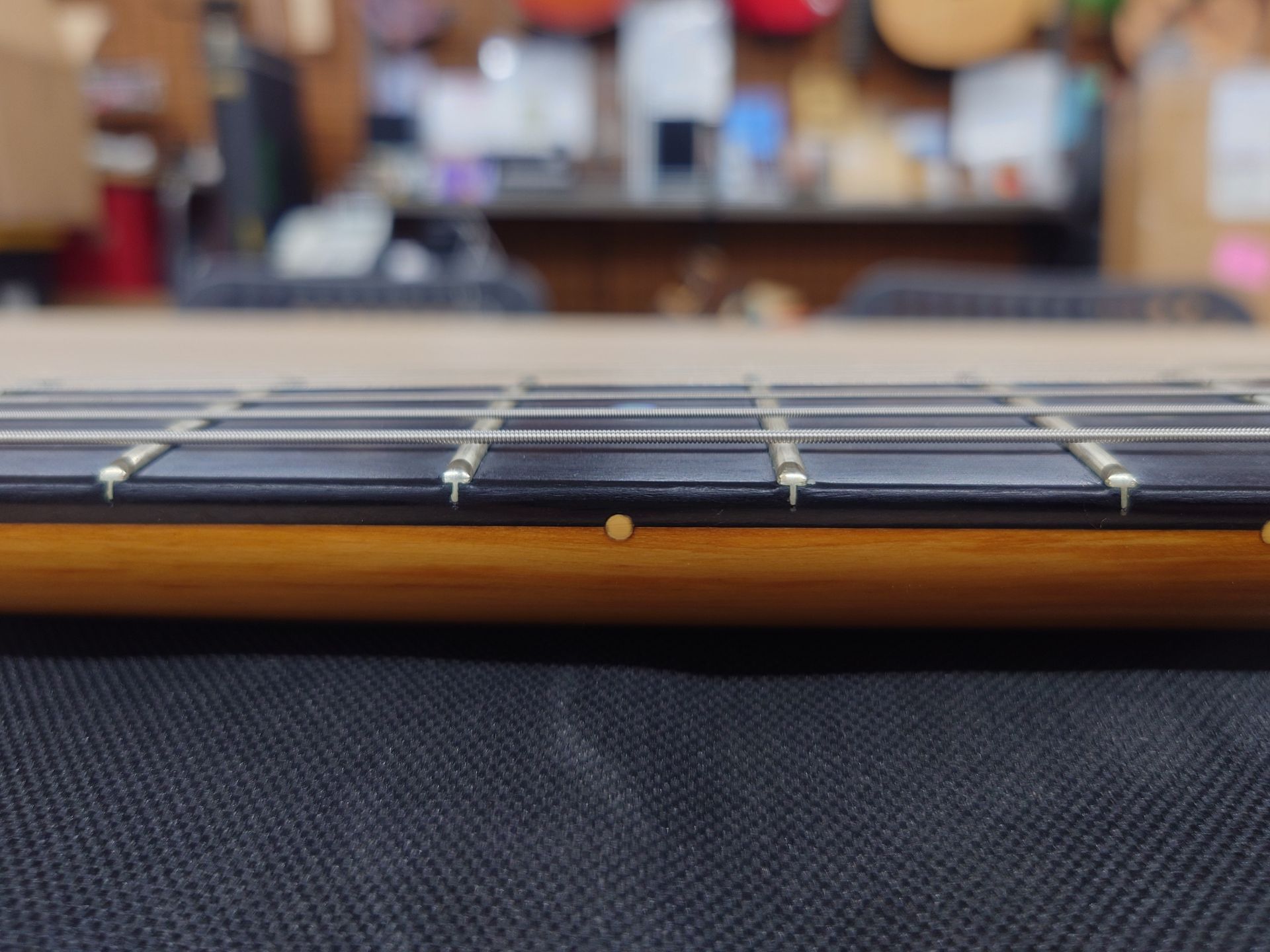 下段は指板サイドにパテが詰められていたり、バインディングが巻かれている仕様のフレット