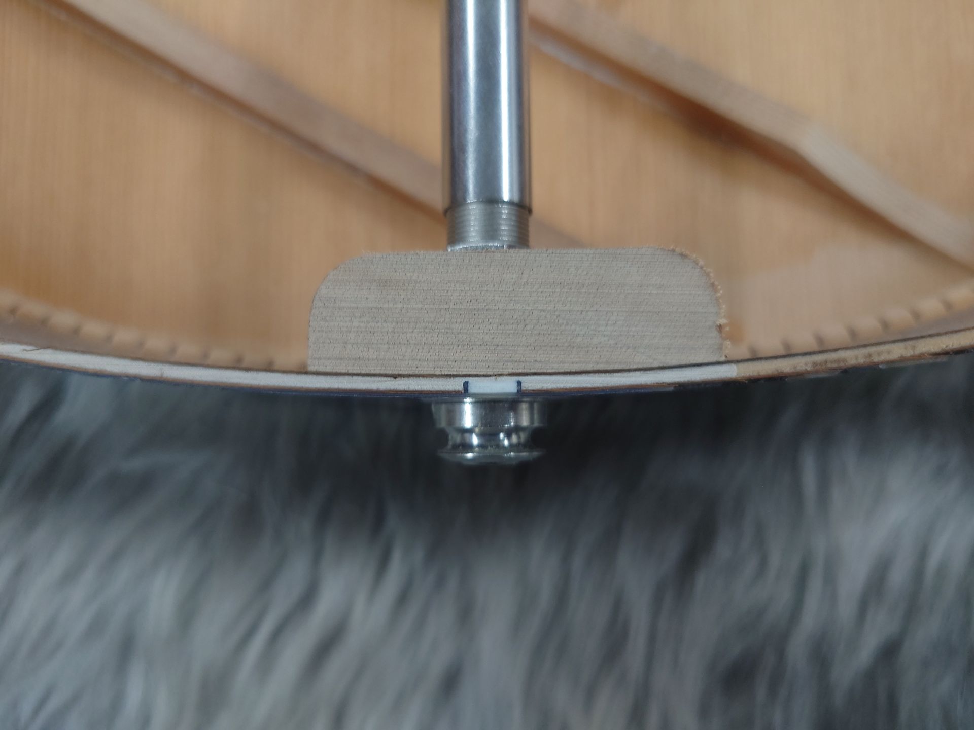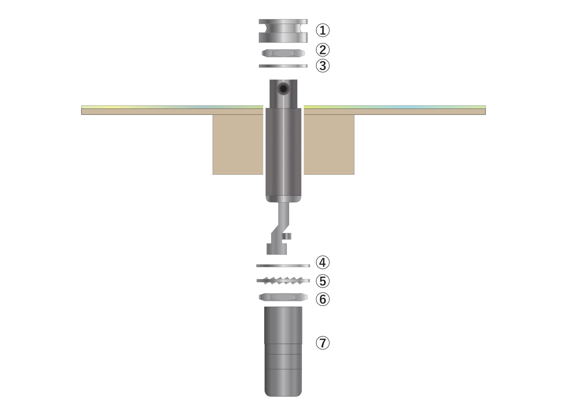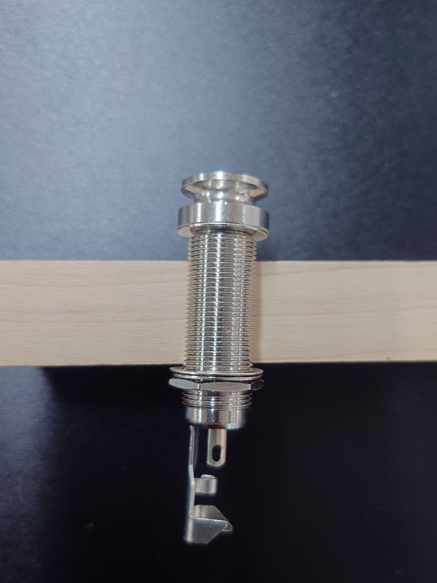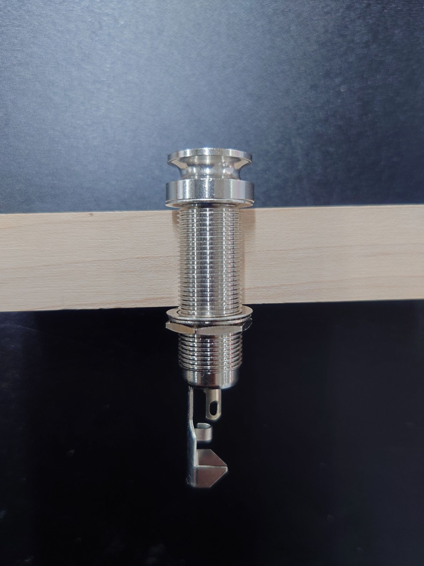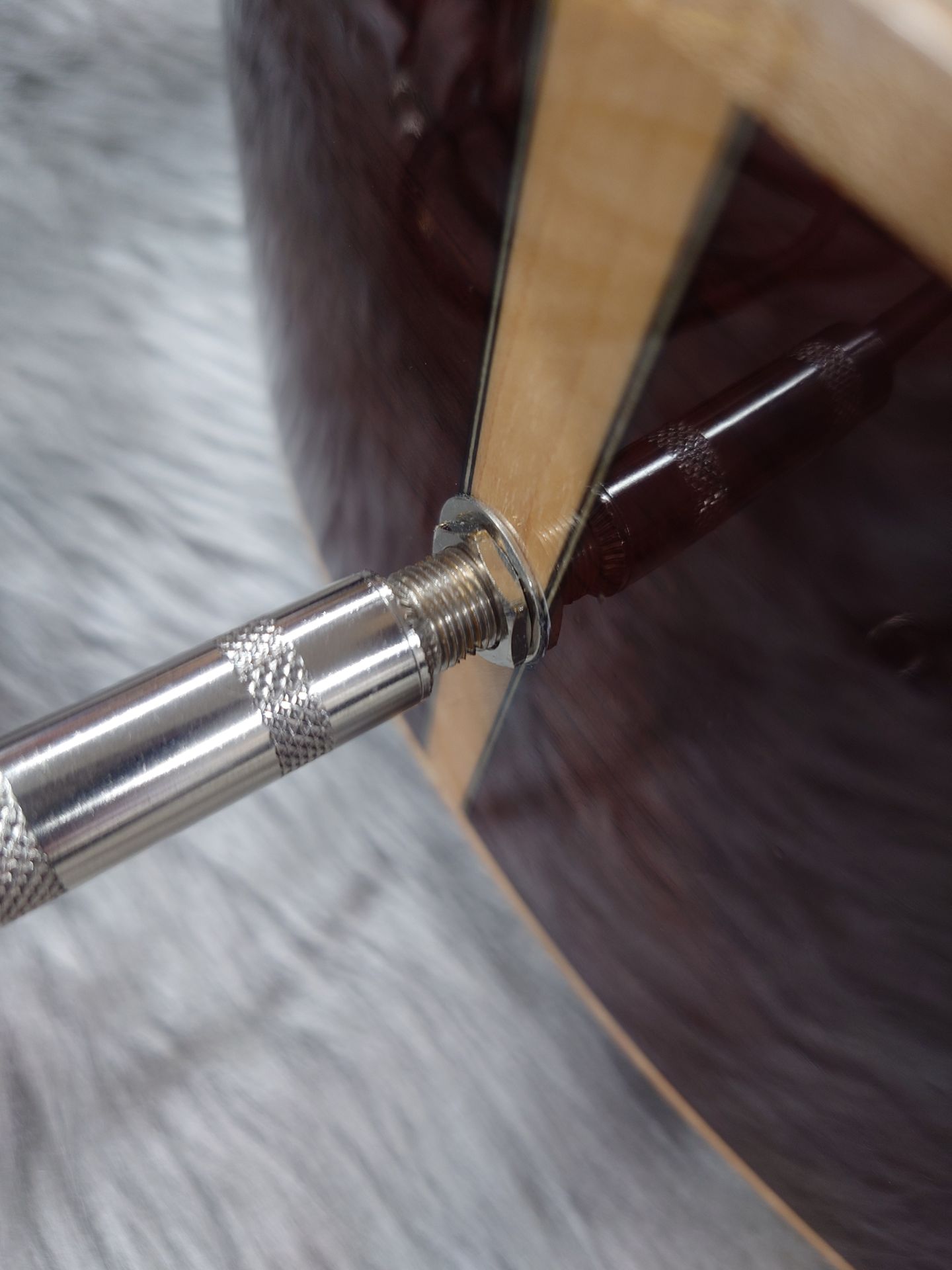 この①~⑦のパーツ(ナットやワッシャーと呼称されるもの)がボディ材を挟むように締め込まれることで、エンドピンジャックは固定されています。