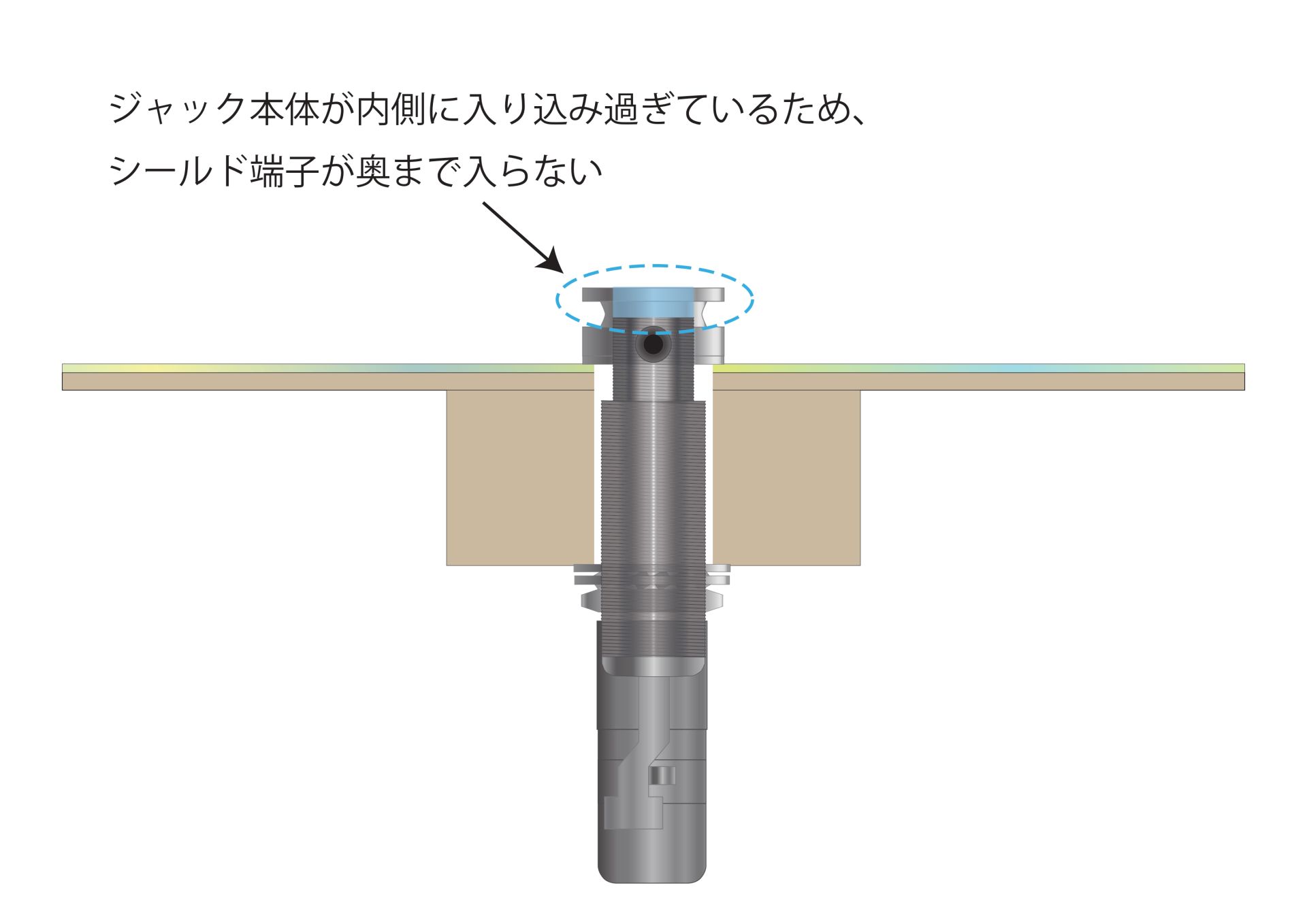シールドのケース(根本)がジャックのカバー(①のエンドピンの役割をしている部分)に干渉してしまい、端子(先端)が部分が奥に届かない、という状況。
