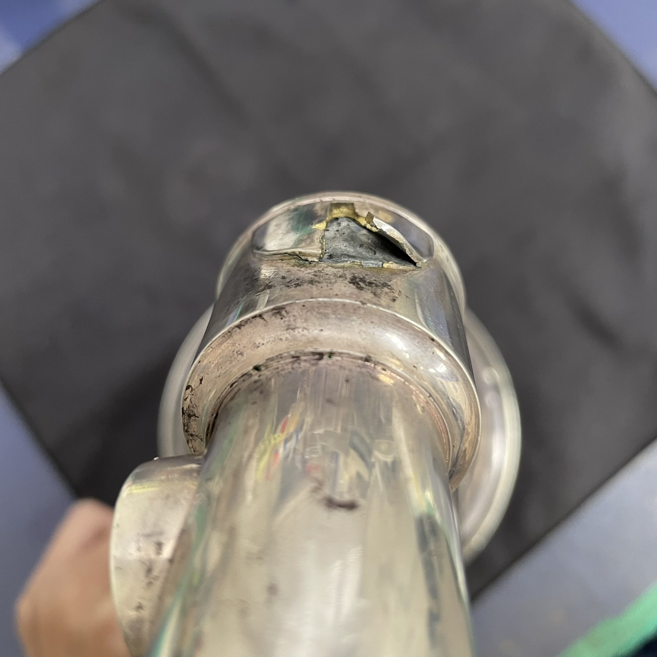 半付けより強力なロウ付けがされている場所ではありますが、かなりの力がかかったようです。ひとまずネックを含め上管、下管などの本体が無事で良かったです。