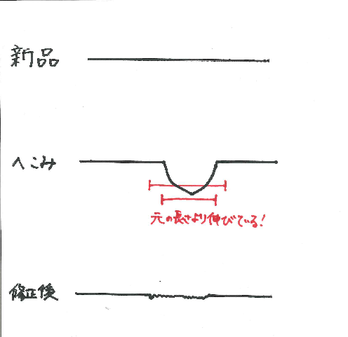 図では細かいナミナミで表現しましたが、どんな大きさの、どんな深さの凹みかで修正痕も変わってきます。