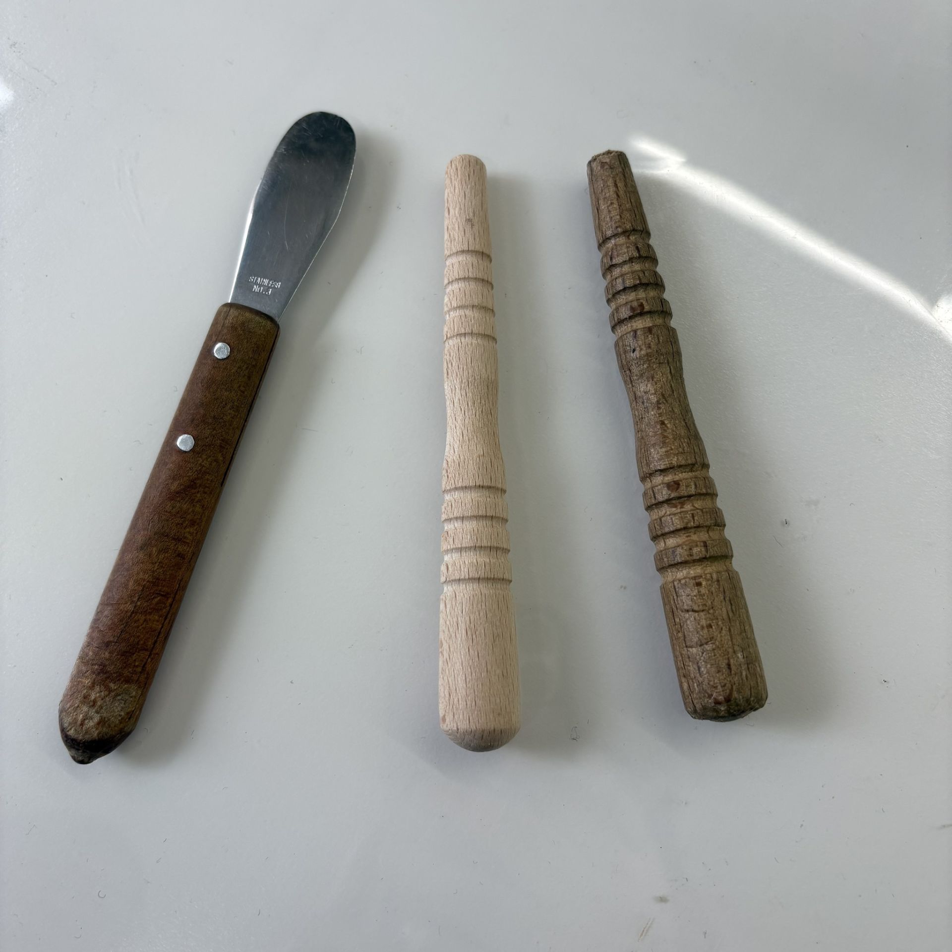 左が自分で加工したヘラで、右が理想の形を追求したらツボ押し棒がピッタリだったという工具!