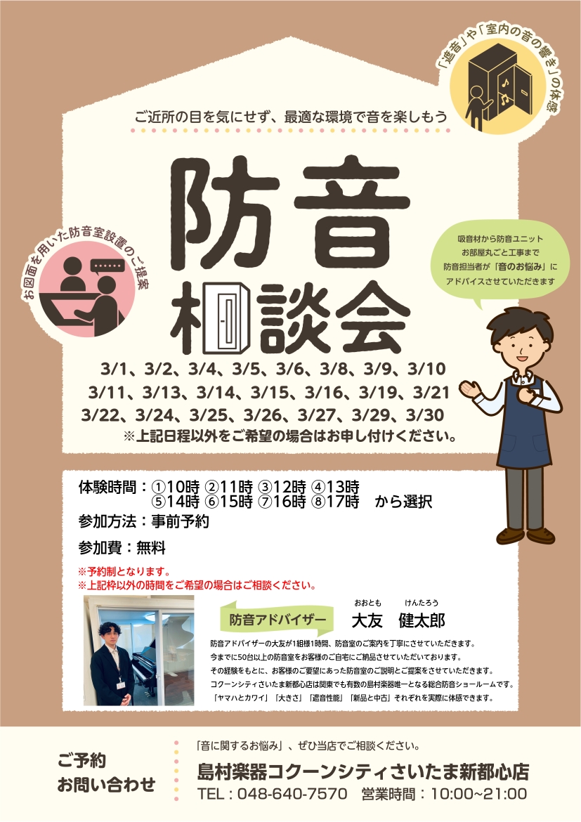 『防音個別相談会』開催中!YAMAHA アビテックス、KAWAI ナサールを同時に体感可能!グランドピアノ、アップライトピアノを防音室内で試せます!ご希望のスケジュールがあれば、大友宛にお店へご連絡いただければと思います。 (Tel.048-640-7570)
